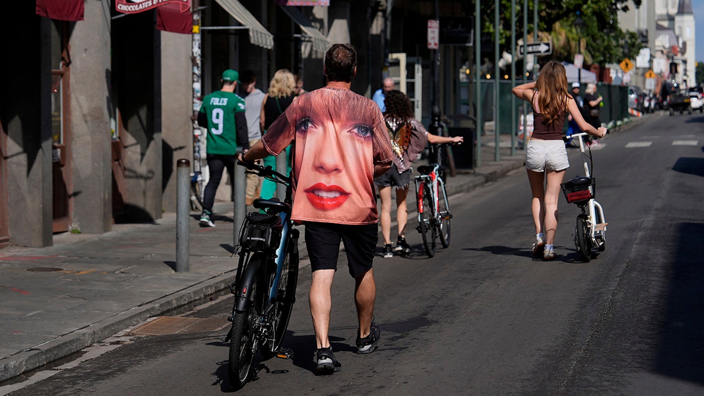 A person wearing a Taylor Swift shirt walks in the French district before the Super Bowl Lix, Sunday, February 9, 2025, in New Orleans. (AP photo / Julia Demaoree Nikhinson)