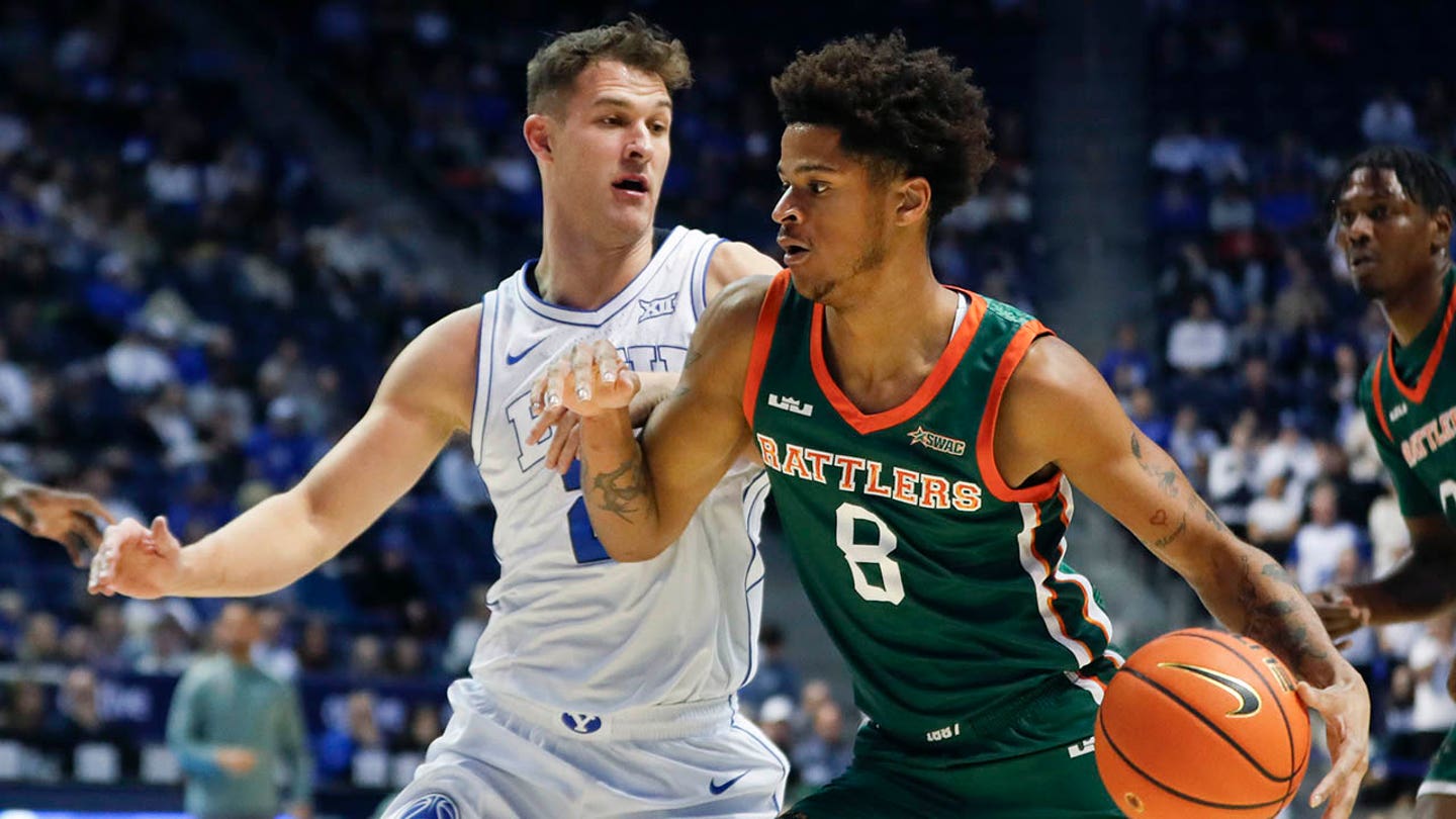 Trevin Knell (21) from the Brigham Young Cougars Shaqir O’Neal (8) of the Rattlers of Florida A&M while he went to the basket during the first half of a match at the Marriot Center on December 20, 2024, in Provo, Utah. (Chris Gardner / Getty Images)
