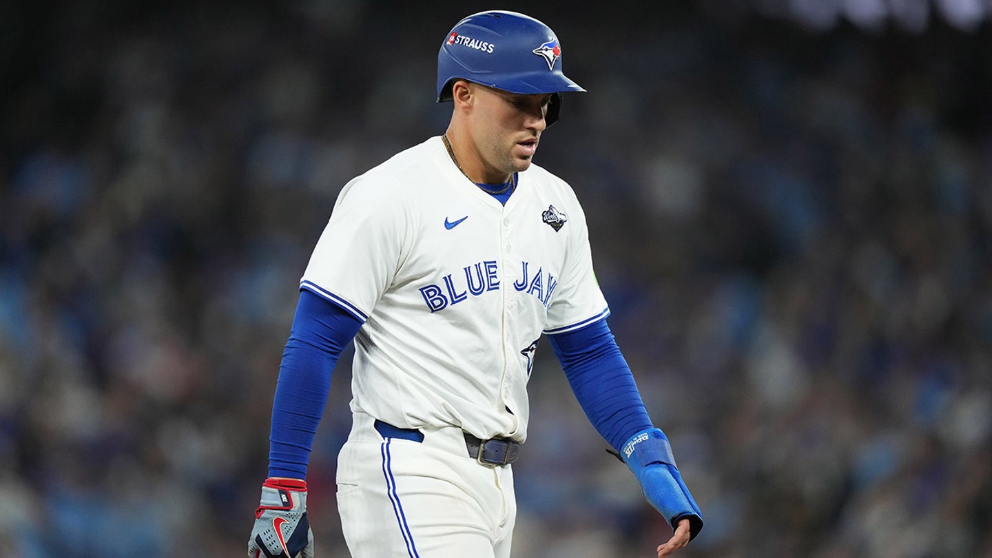 Toronto Blue Jays designated hitter George Springer (4) returns to the dugout after being thrown out at second base to end the first inning against the Los Angeles Dodgers in Game 7 of the Baseball World Series in Toronto on Saturday, November 1, 2025. (Nathan Denette/The Canadian Press via AP)
