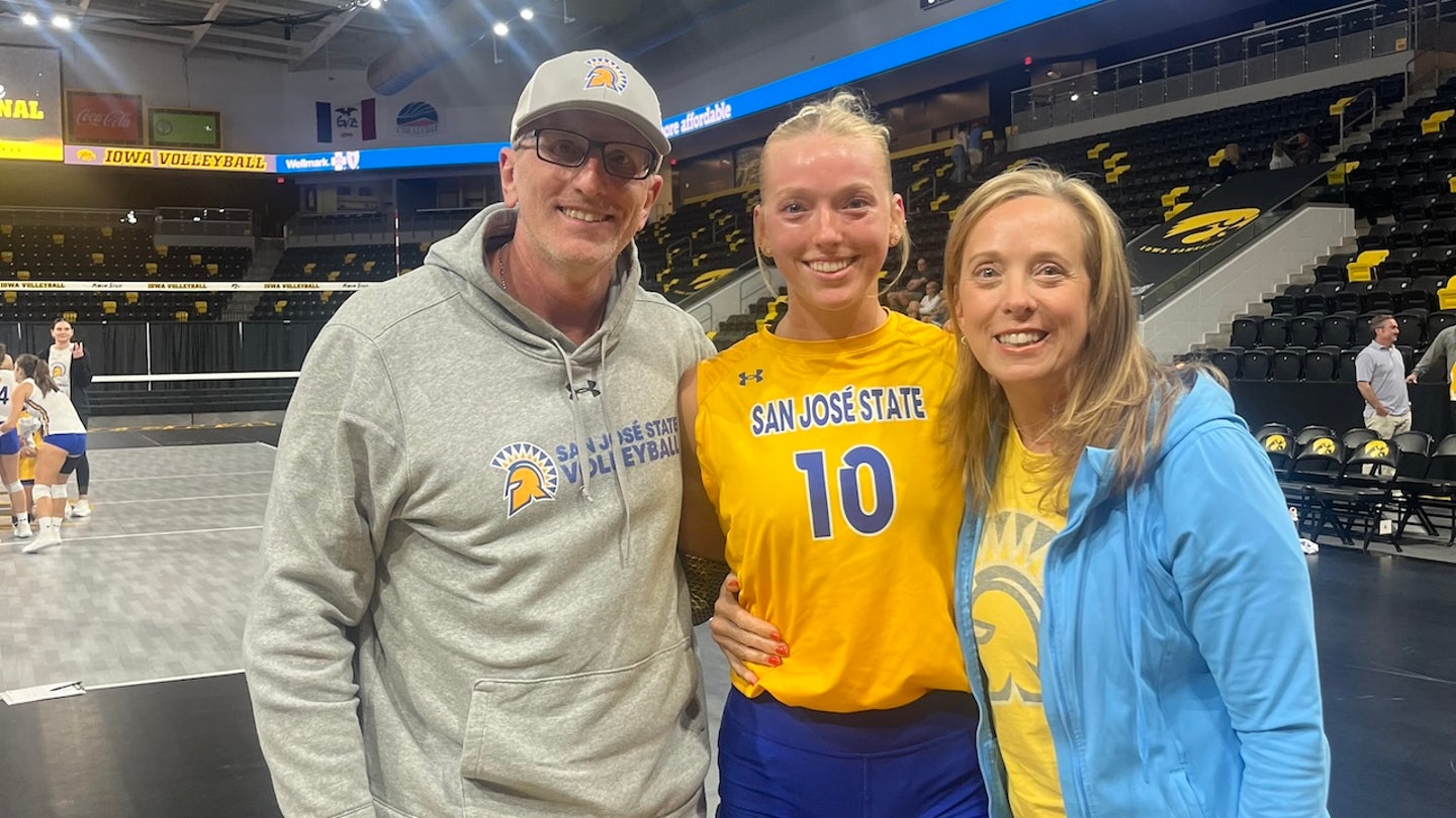 Former SJSU volleyball star Brooke Slusser and her parents Paul and Kim Slusser at a game Sept. 8, which Kim said is “the last good memory we have of her playing.” (Courtesy of Kim Slusser)