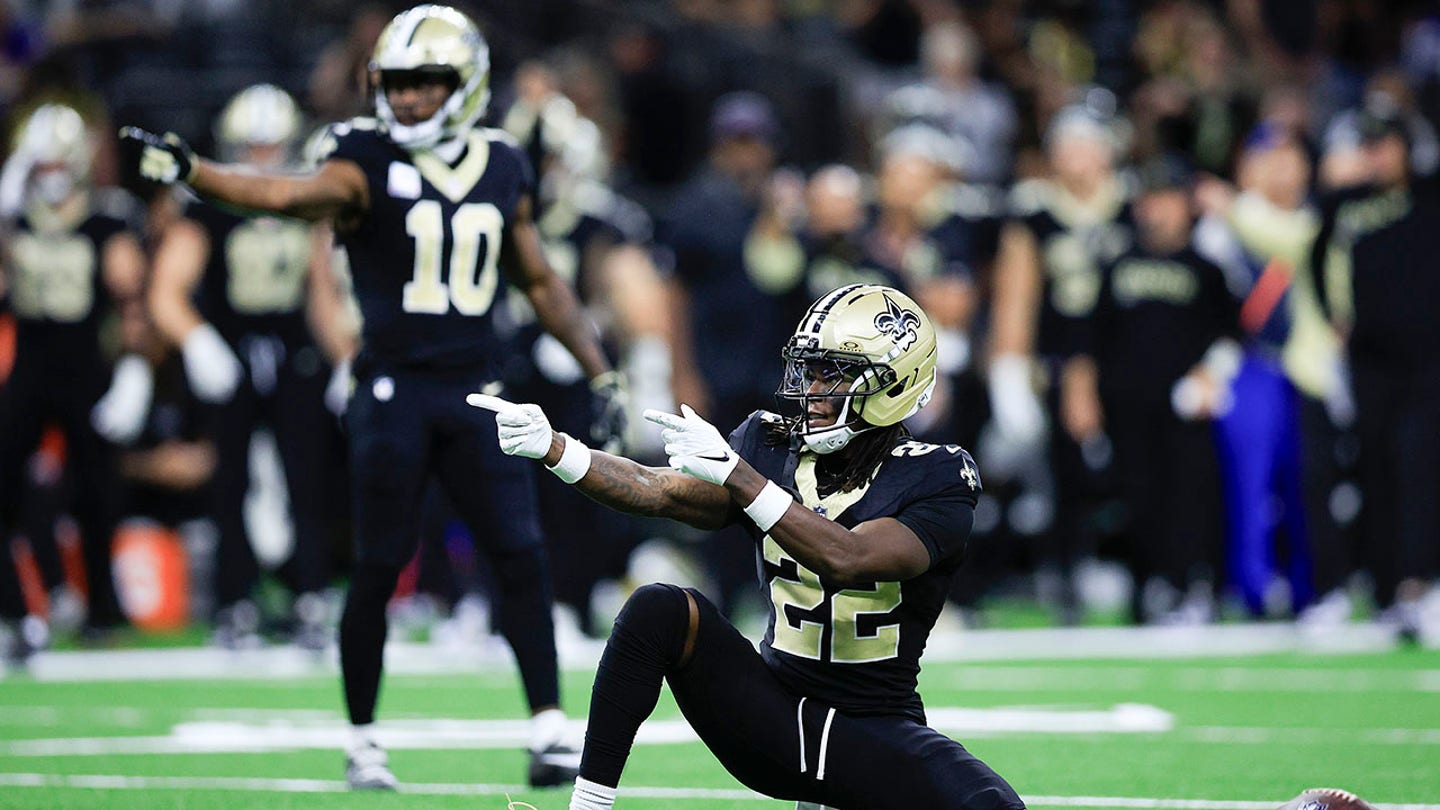 Rashid Shaheed of the New Orleans reacts after a first descent during the fourth quarter against the New York giants in the match in Caesars Superdome on October 5, 2025 in New Orleans, Louisiana. (Sean Gardner / Getty Images)