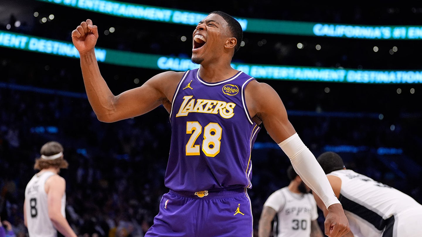 Los Angeles Lakers forward Rui Hachimura celebrates after San Antonio Spurs forward Julian Champagnie missed a free throw with the Lakers leading by two points and less than a second on the clock during the second half of an NBA basketball game, Wednesday, Nov. 5, 2025, in Los Angeles. (AP Photo/Mark J. Terrill)