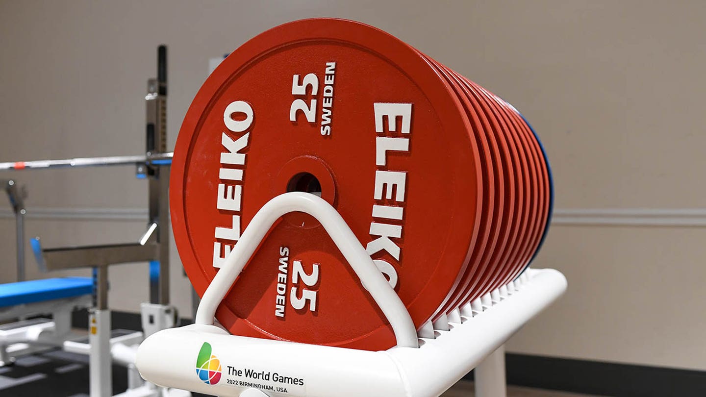 A stack of weights in the warm-up room during a weightlifting event. (Kevin Langley/Icon Sportswire via Getty Images)