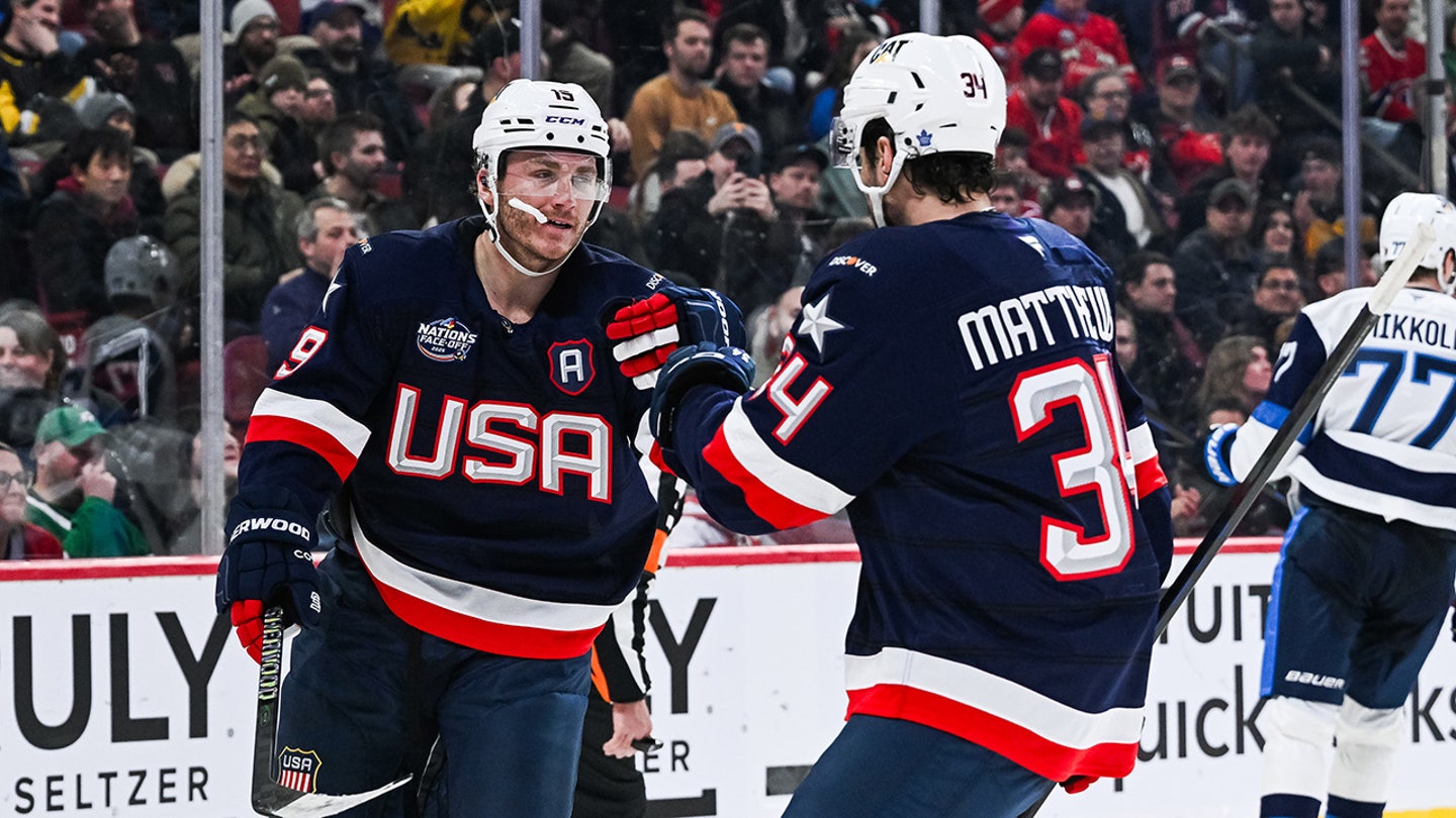 The United States team striker Matthew Tkachuk (19) famous with the USA Auston Matthews team striker (34) his goal against the Finland team in the third period in an ice hockey match From 4 nations to the Bell Center. (Images of David Kirouac-Imagn)