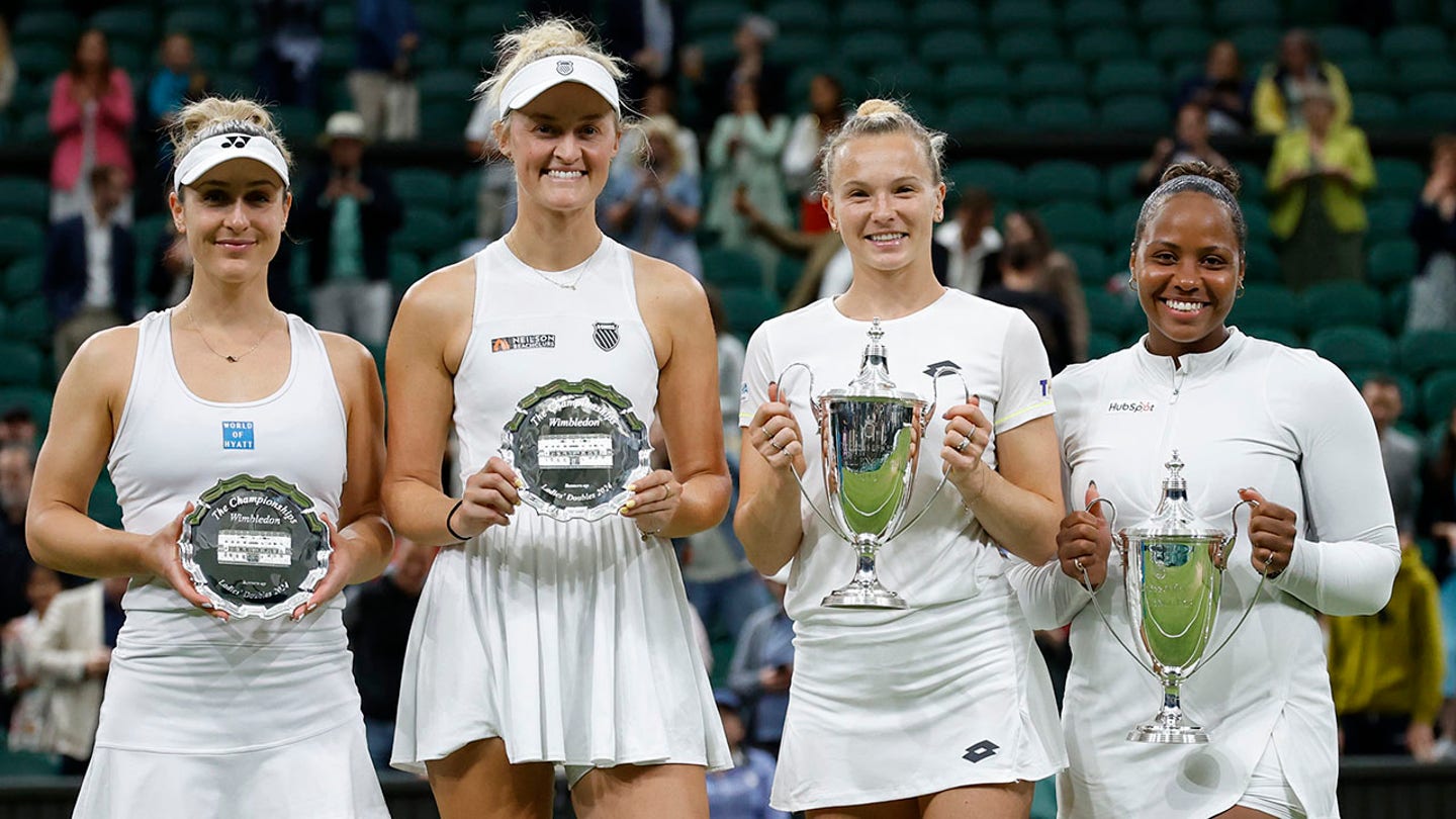 From left to right, Gabriela Dabrowski (CAN) and Erin Roudliffe (NZL) and Katerina Siniakova (Cze) and Taylor Townsend (USA) pose with the finalists and championship trophies, respectively, after the double of Wimbledon ladies in 2024. (Geoff Burke-USA today Sports)
