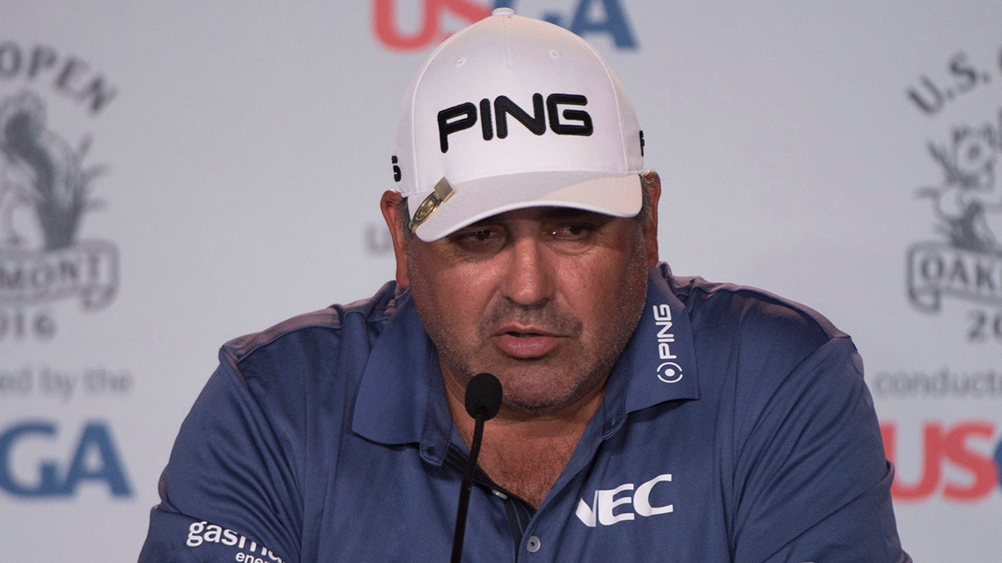 Angel Cabrera addresses the media at a press conference during training sessions on Wednesday of the 2016 American golf tournament in Oakmont CC in Oakmont, Pennsylvania, June 15, 2016. (Kyle Terada-USA today Sports)