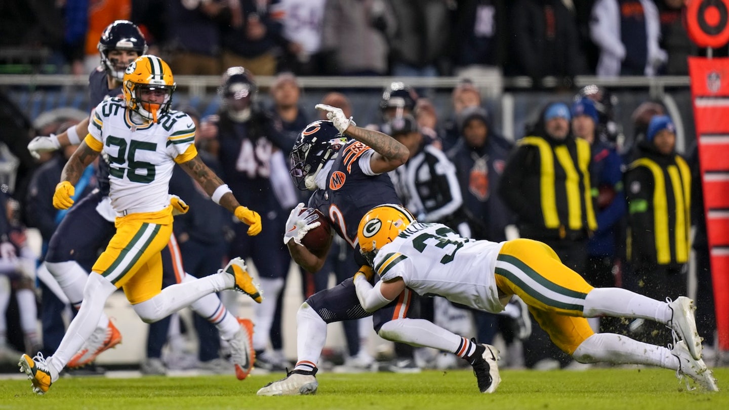 Evan Williams #33 of the Green Bay Packers tackles DJ Moore #2 of the Chicago Bears during the first half of an NFL Wild Card football game at Soldier Field on January 10, 2026 in Chicago. (Todd Rosenberg/Getty Images)