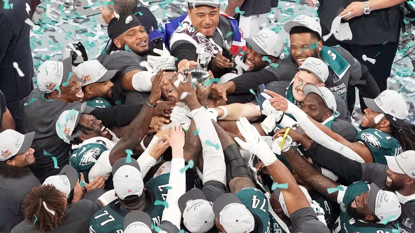 The Philadelphia Eagles raise the Vince Lombardi trophy after defeating the Kansas City chiefs in the Super Bowl Lix. (James Lang-Imagn images)