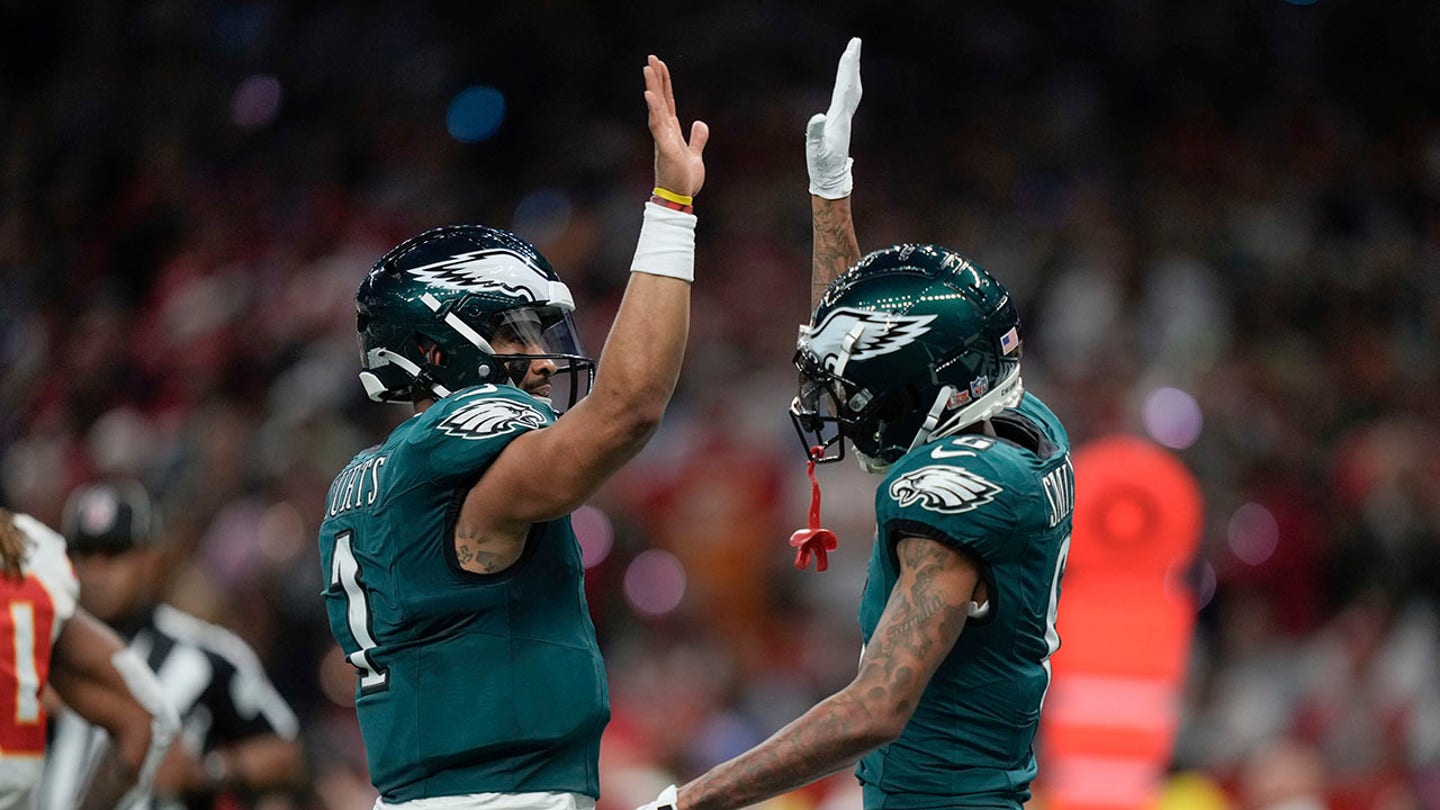 The quarter of the Eagles of Philadelphia, Jalen Hurts, on the left, famous with the wide receiver Devonta Smith, on the right, after a touch of the wide AJ Brown receiver during the first half of the Super Bowl 59 football match of the NFL against the Chiefs of Kansas City, Sunday February 9, 2025, in New Orleans. (AP photo / Matt Slocum)