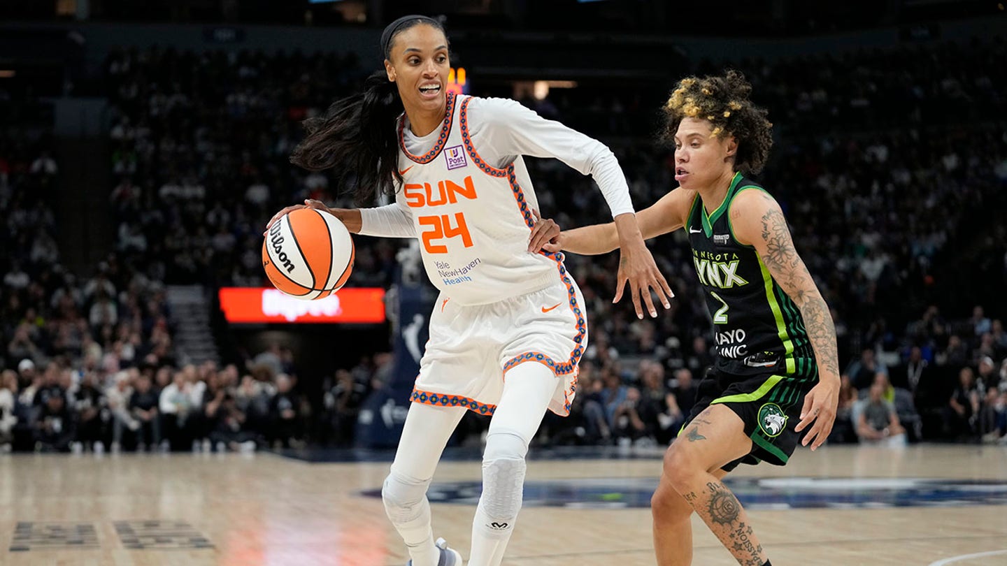 The Connecticut Sun Dewanna Bonner striker, # 24, works towards the basket while the Minnesota Lynx Natisha Hiedeman, # 2 goalkeeper defends during the first match 5 of a semi-final of basketball wnba on 8 October 2024 in Minneapolis. (Photo / abbie parr, file)