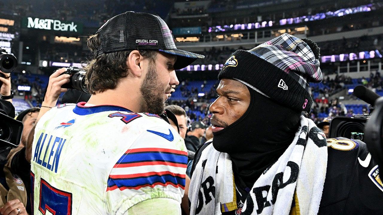 Josh Allen, on the left, of the Buffalo Bills and Lamar Jackson of the Baltimore Ravens hovers after a match at M&T Bank Stadium on September 29, 2024, in Baltimore. (G FIUME / GETTY Images)