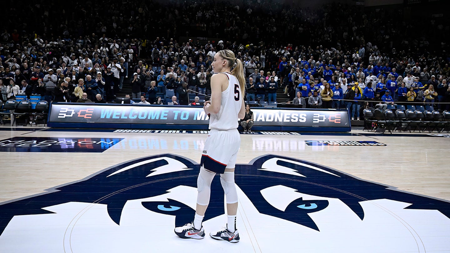 Uconn Paige Bueckers’ guard is addressed to fans after his last game at Gampel Pavilion at the end of a second round match against the state of southern Dakota in the NCAA basketball tournament on Monday, March 2025, in Storrs, Conn. (AP photo / Jessica Hill)