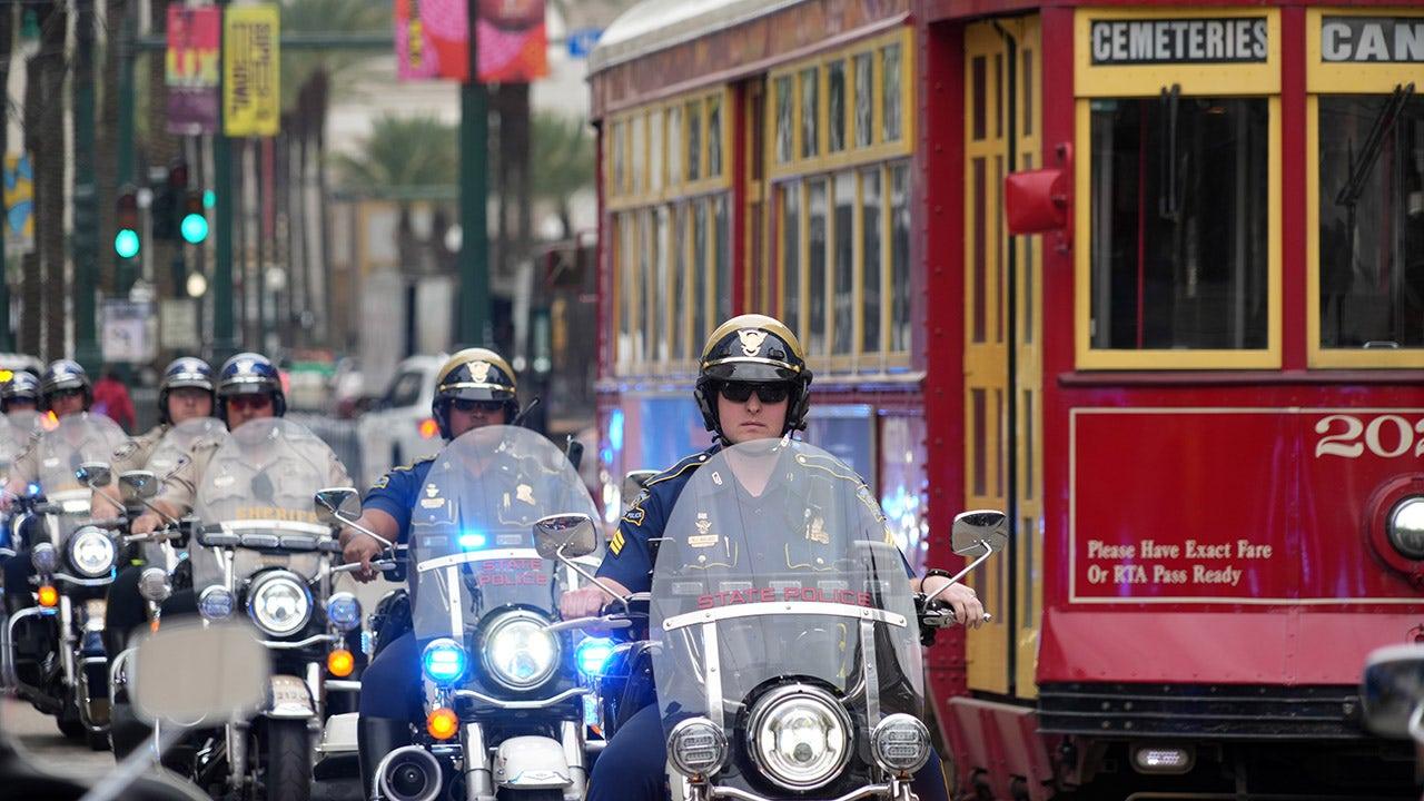 Motorcycle officers of the State police from Louisiana on Canal Street before the Super Bowl Lix. (Kirby Lee-Imagn images)