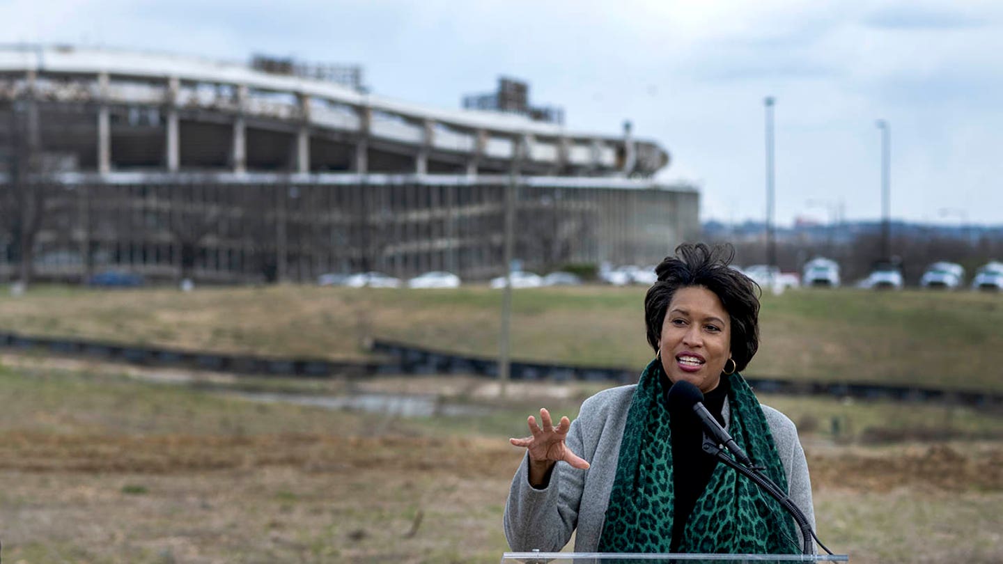 Mayor Muriel Bowser reveals plans for a new DC prison on Hill East as well as a new Sports Complex on the Robert F. Kennedy Memorial Stadium site, photographed in Washington, DC on March 28, 2022. (Marvin Joseph / The Washington Post via Getty Images)