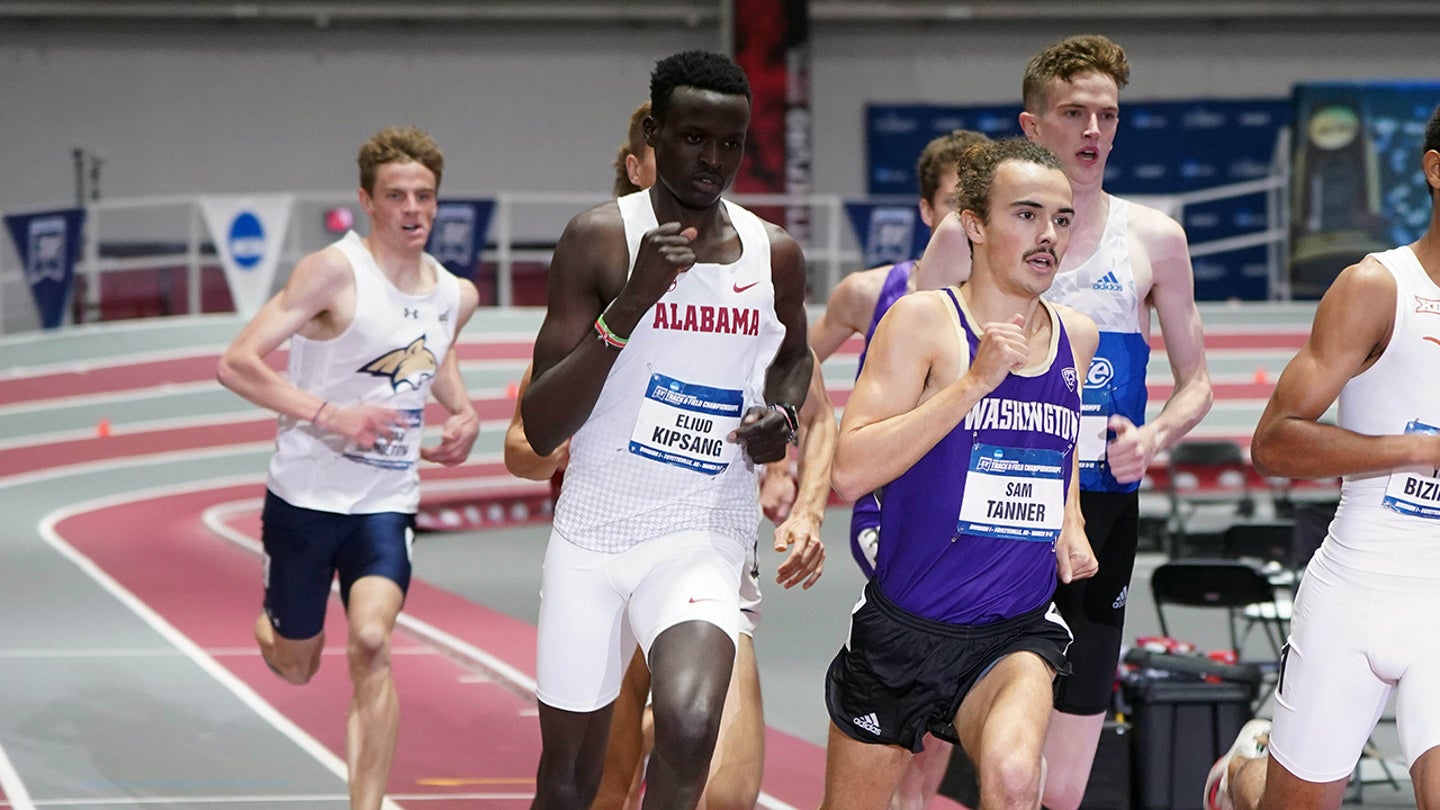 File – ELIUD KIPSANG DE L’ALABAMA, Sam Tanner of Washington and Yusuf Bizimana from Texas lead a mile of heat during the NCAA track and indoor field championships at Randal Tyson Center on March 12, 2021. (Kirby Lee-USA today Sport)