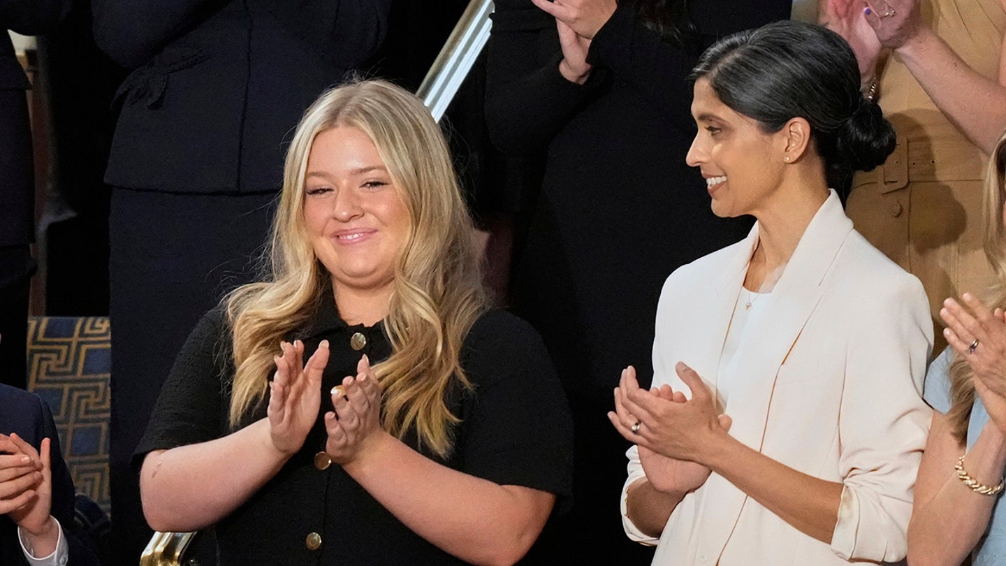 Payton McNabb, on the left, applauds while the second Lady Usha Vance looks at the address of President Donald Trump to a joint congress session in Capitol in Washington on Tuesday, March 4, 2025. (AP photo / Alex Brandon)