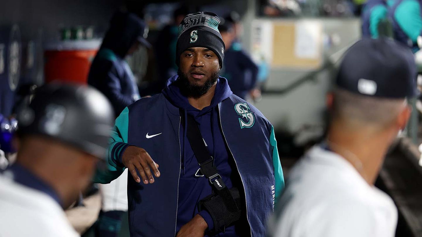 Victor Robles des Mariners de Seattle looks with his arm in a scarf during the match against the Houston Astros at T-Mobile Park on April 7, 2025 in Seattle, Washington. (Steph Chambers / Getty Images)