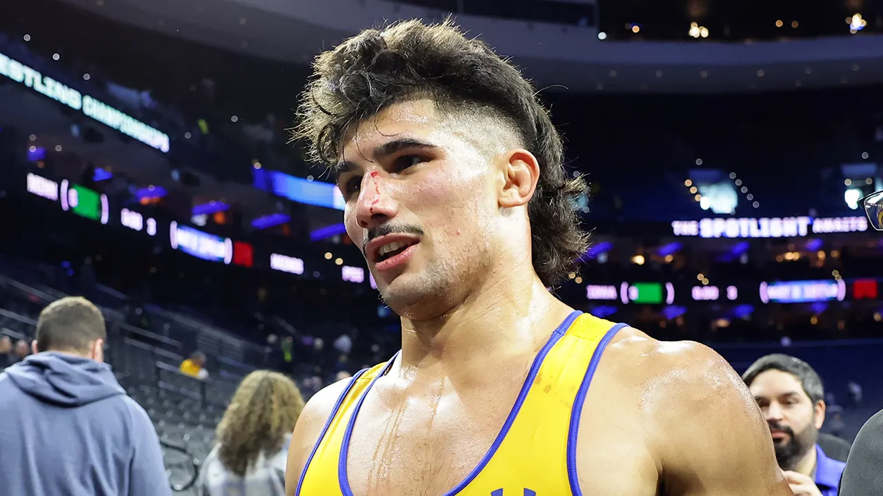 AJ Ferrari from Cal State Bakersfield Roadrunners left the carpet after winning the 3rd place match at the NCAA 2025 division I championships at the Wells Fargo Center on March 22, 2025 in Philadelphia. (Hunter Martin / Getty Images)