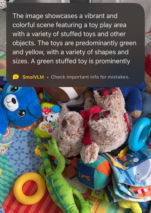 I then pointed out my camera on the gaming park of my son full of toys that I had not yet cleaned. Again, AI did an excellent job with the large features by describing the playground and the toys inside. He obtained the correct colors and even the correct textures when identifying toys in stuffy against the blocks. He also fell into certain details. For example, he called a bear a dog and seemed to think that a stacking ring was a bullet. Overall, I would call the AI of Huggingsnap, ideal for describing a scene to a friend but not good enough for a police report.
