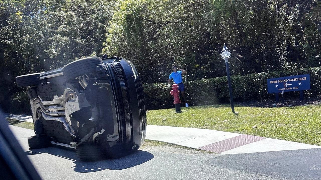 Tiger Woods stands next to his overturned vehicle in Jupiter Island, Florida, Friday, March 27, 2026. (Jason Oteri/AP)
