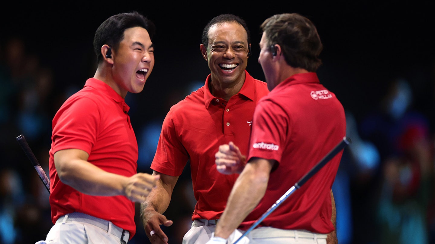 From left to right, Tom Kim, Tiger Woods and Kevin Kisner by Jupiter Links Golf Club celebrate after their TGL presented by Sofi Match against Boston Common Golf at Sofi Center on January 27, 2025 in Palm Beach Gardens, Florida. (Carmen Mandato / TGL / TGL via Getty Images)