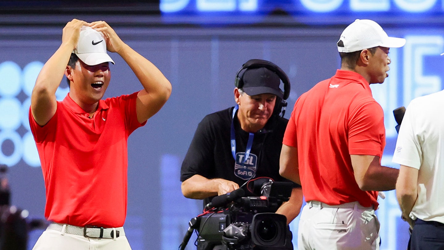 Tom Kim by Jupiter Links Golf Club reacts to a shot by his teammate Tiger Woods on the 13th hole in his TGL presented by Sofi Match against the New York Golf Club at Sofi Center on February 18, 2025 in Palm Beach Gardens, Florida. (Megan Briggs / TGL / TGL via Getty Images)
