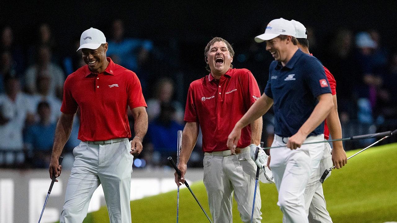 Kevin Kisner, center, laughs after having barely missed a putt next to Tiger Woods, on the left, Jupiter Links GC and Matt Fitzpatrick of the New York Golf Club in a TGL match at Sofi Center at Palm Beach State College on 18 February 2025 in Palm Gardens de Plage, Florida. (Greg Lovett / Palm Beach Post / USA TODAY Network via Imagn Images)