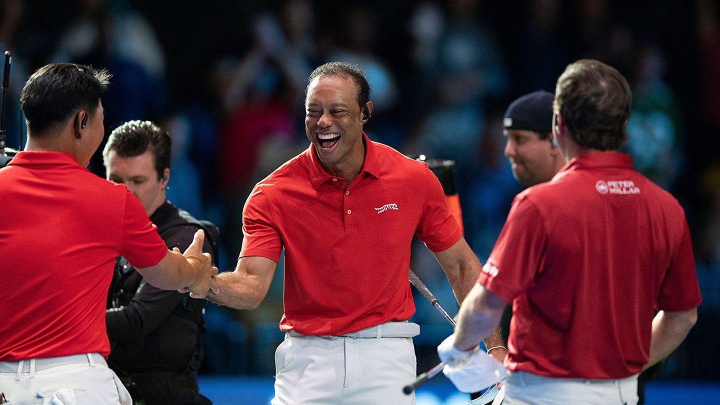 Tiger Woods of Jupiter Links celebrates a victory with Tom Kim, on the left, and Kevin Kisner, on the right, in a TGL match against the common fund at the Sofi Center on January 27, 2025, in Palm Beach Gardens, in Florida. (Imagn)