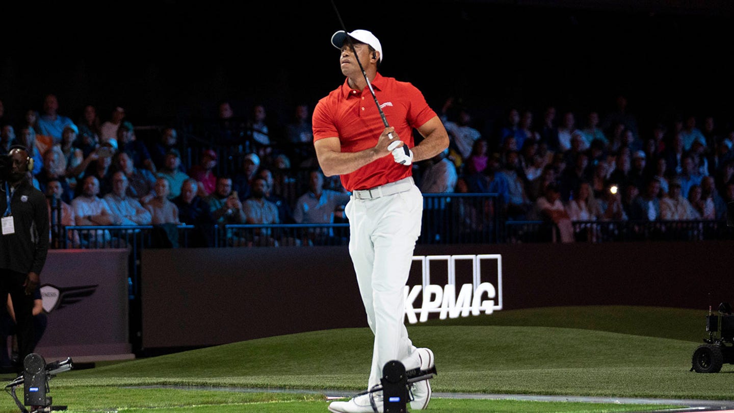 Jupiter Tiger Woods connects GC t-shirts in a TGL match against the common fund at the Sofi Center on January 27, 2025, in Palm Beach Gardens, Florida. (Imagn)