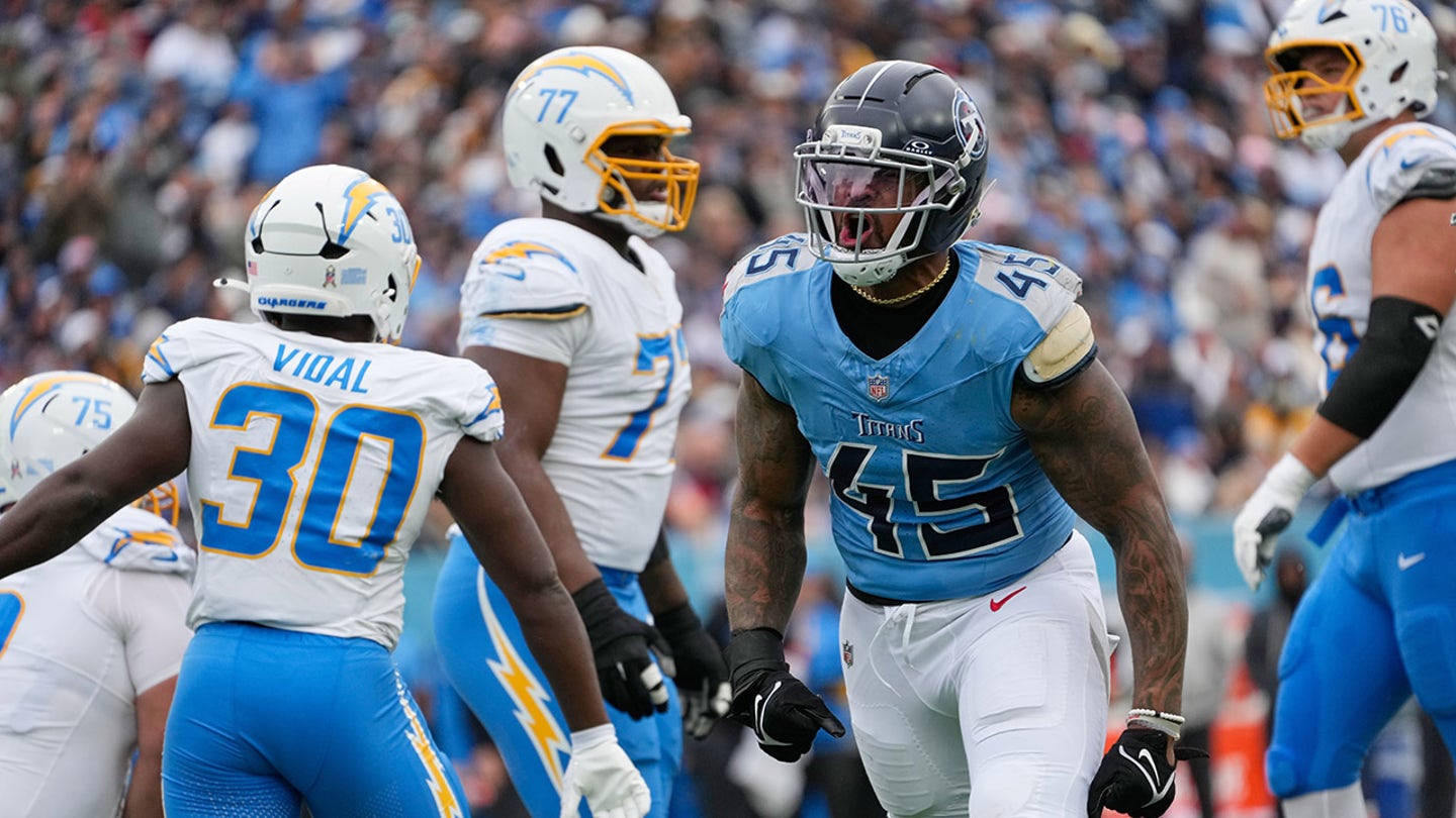 Tennessee Titans linebacker Dre’Mont Jones (45) celebrates after a sack during the first half of an NFL football game against the Los Angeles Chargers, Sunday, Nov. 2, 2025, in Nashville, Tennessee. (AP Photo/George Walker IV)