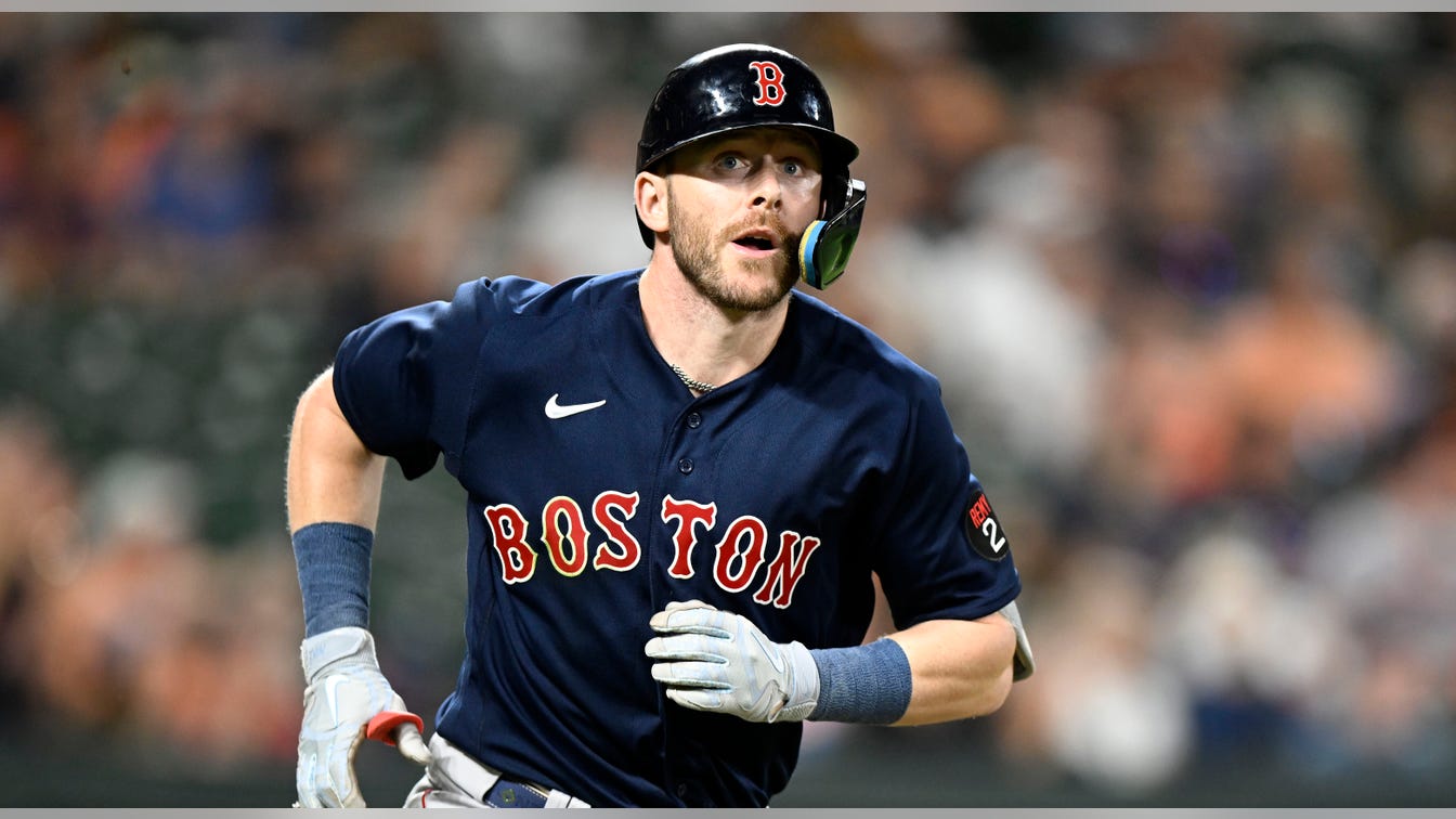 Trevor Story of the Boston Red Sox goes to first base against the Baltimore Orioles at Oriole Park at Camden Yards in Baltimore, Maryland on September 10, 2022. (G Fiume/Getty Images)
