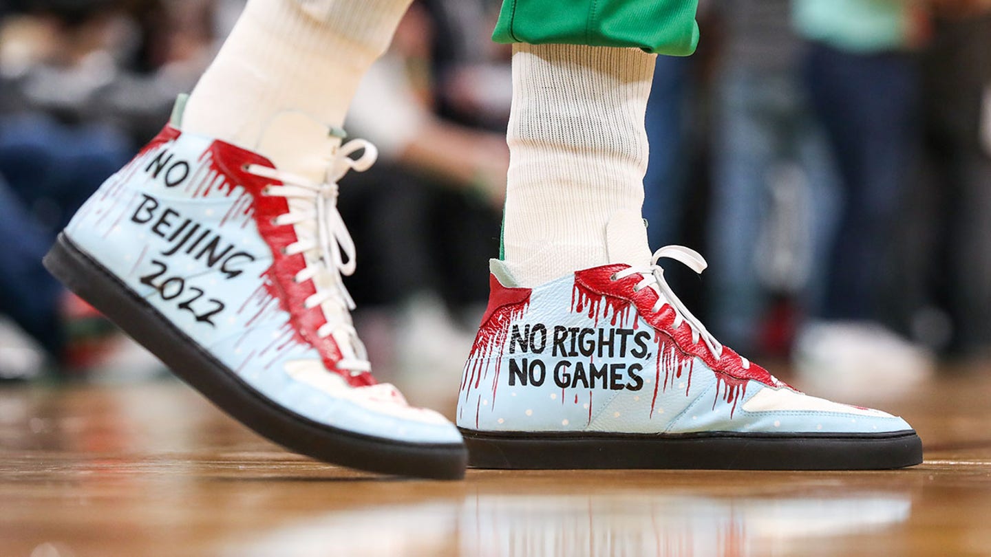 The shoes of the Boston Celtics Center Enes Kanter Freedom, # 13, before playing Chicago Bulls at TD Garden in Boston on November 1, 2021. (Paul Rutherford-USA TODAY SPORTS)