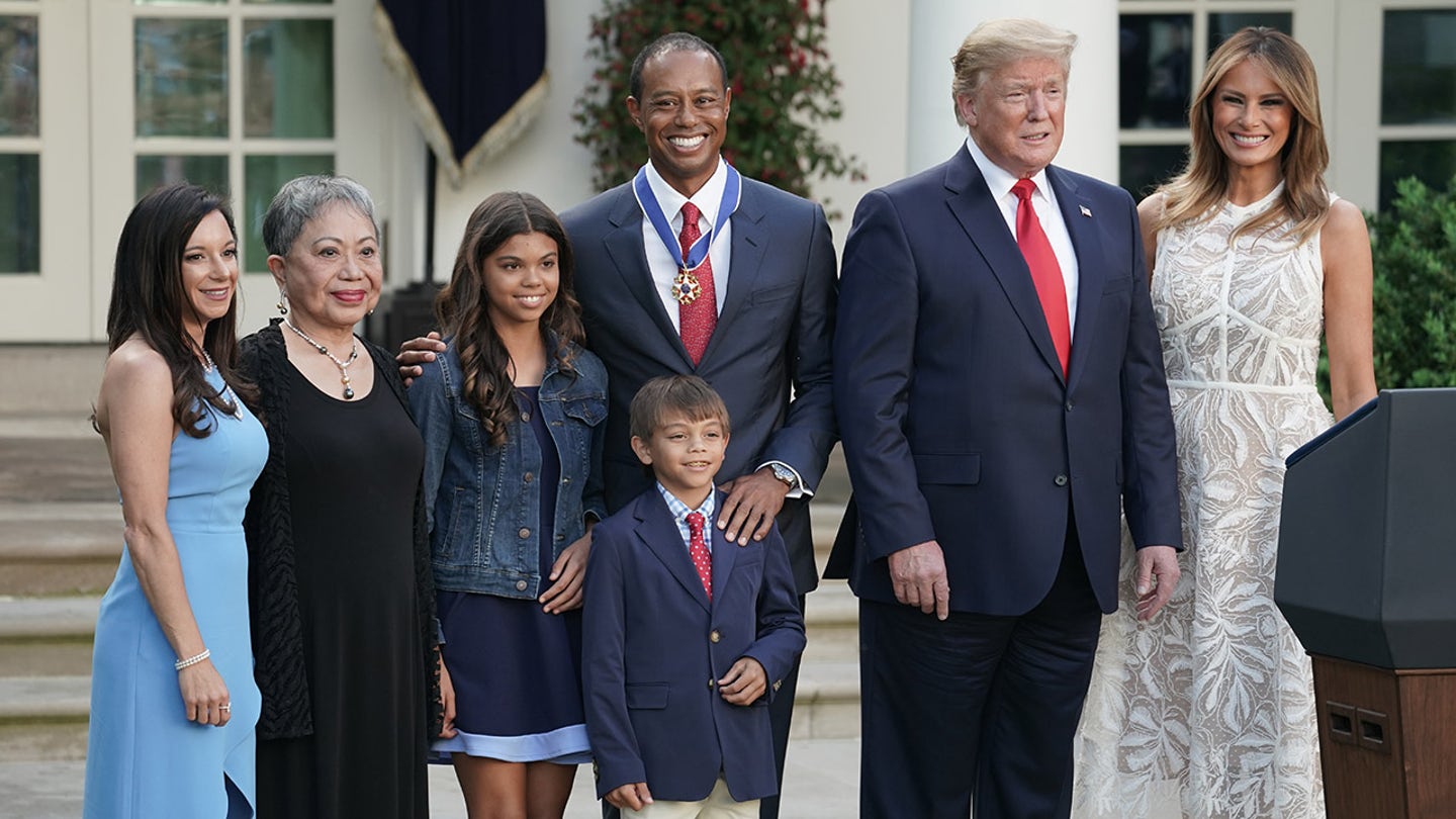 From left to right, Erica Herman, Kultida Woods, Sam Alexis Woods, Charlie Axel Woods, Tiger Woods, President Donald Trump and First Lady Melania Trump pose for photos after Tiger Woods was presented with the Liberty Medal The White House, May 6, 2019. (SOMODEVILLA / GETTY Images)
