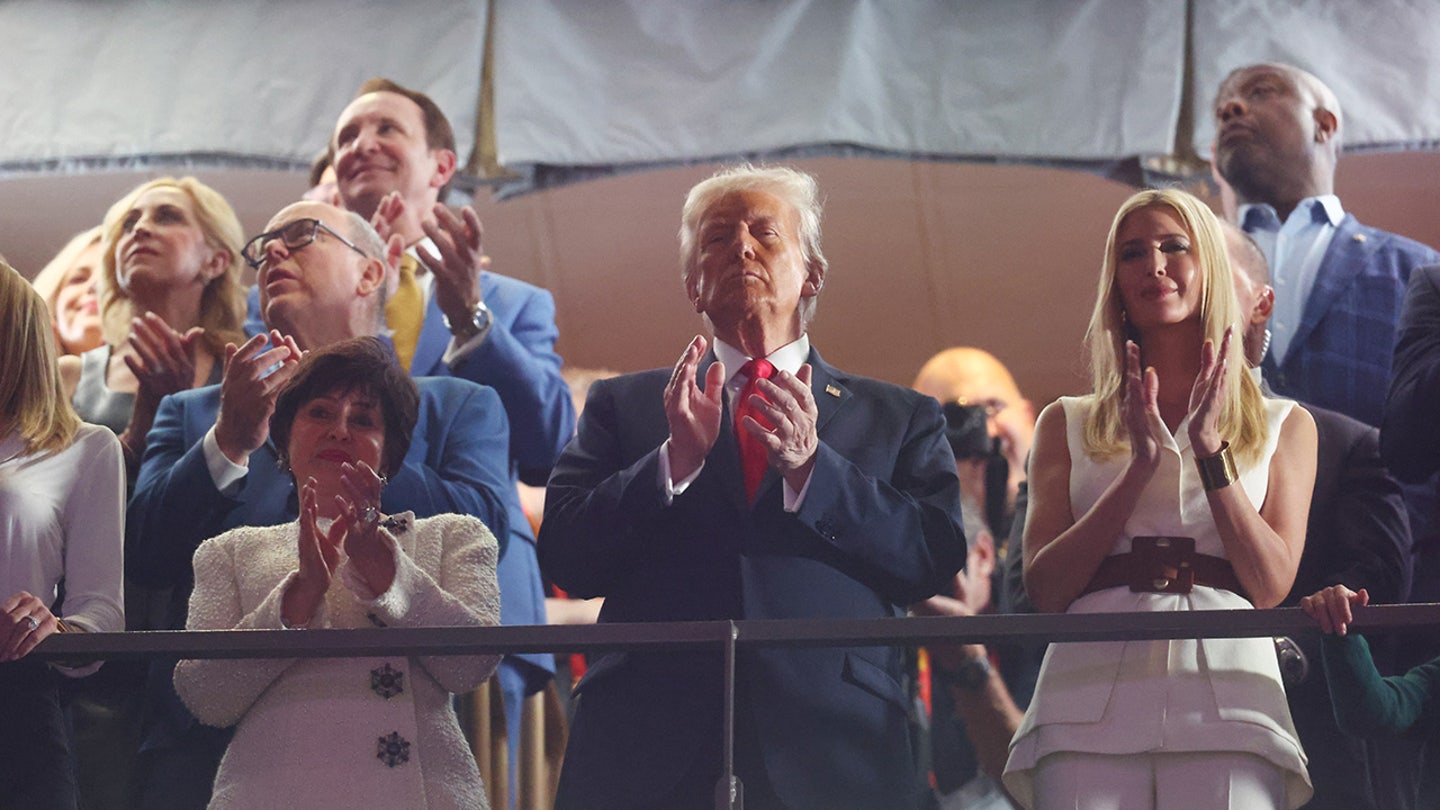 President Donald Trump and Ivanka Trump react during the national anthem at the Super Bowl Lix. (Images of Mark J. Rebilas-Imagn)