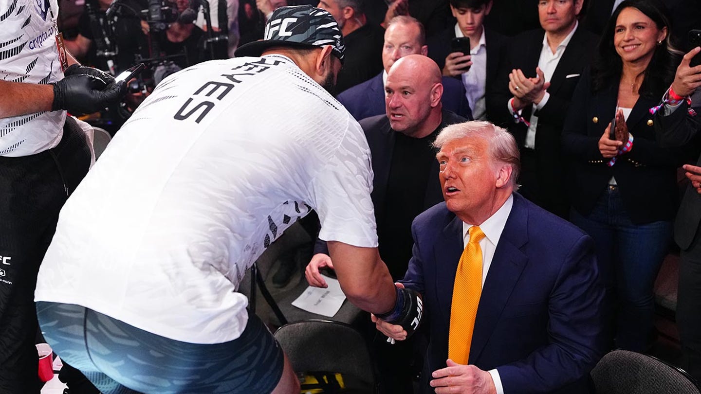US President Donald Trump congratulates Dominick Reyes after his direct elimination victory at the UFC 314 event in Kaseya Center on April 12, 2025 in Miami, Florida. (Jeff Bottari / Zuffa LLC)