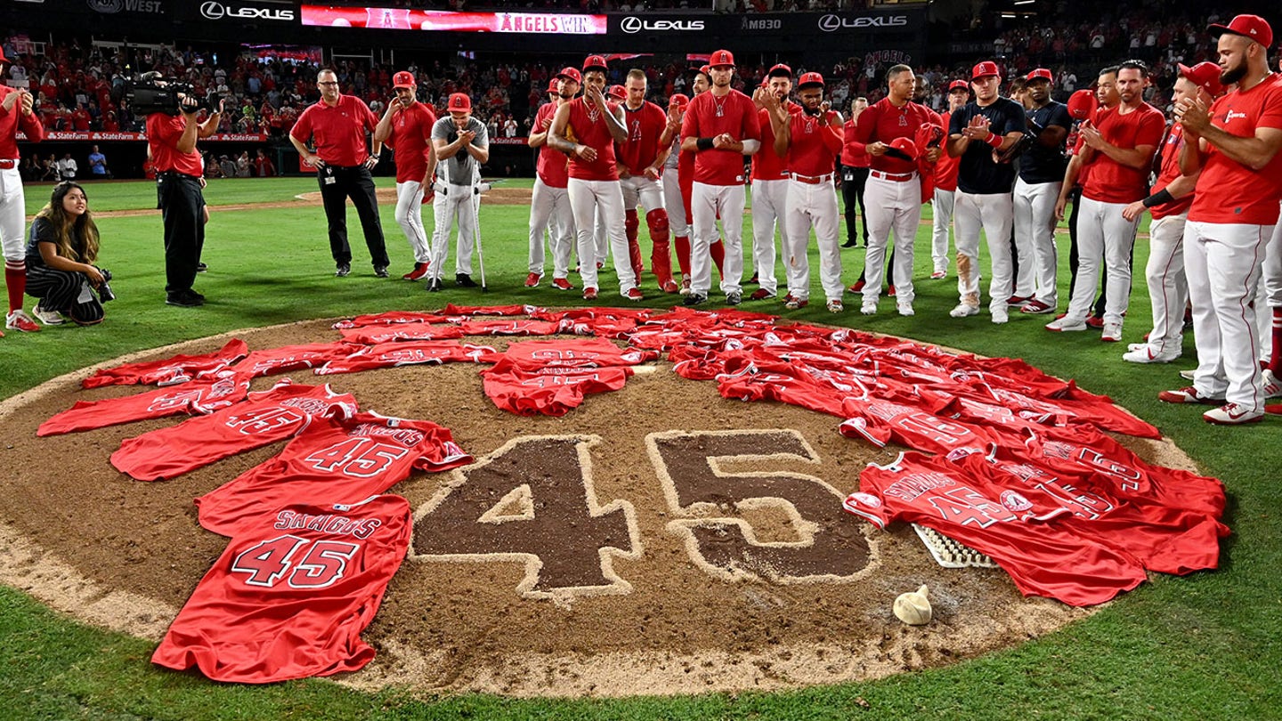 Members of the Los Angeles Angels after players placed their jerseys on the mound in honor of Tyler Skaggs after he pitched a no-hitter to defeat the Seattle Mariners on July 12, 2019, in Anaheim, California. (Keith Birmingham/MediaNews Group/Pasadena Star-News via Getty Images)