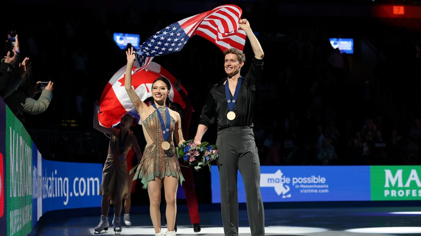 The gold medalists Madison Chock and Evan Bates of the United States celebrate after winning the World Dance Championship in Ice Dance at the ISU 2025 World Skating Championships at TD Garden in Boston on March 29, 2025. (Maddie Meyer / Getty Images)