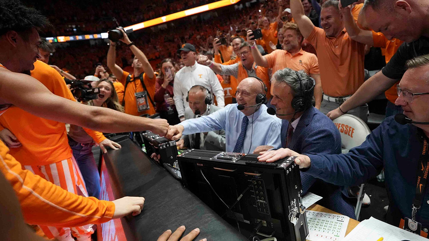 Tennessee players celebrate with Dick Vitale after the Alabama match in Thompson-Boling Arena in downtown Food on March 1, 2025. (Imagn)