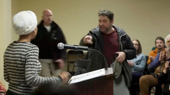 A man shouts at us. Rep. Ilhan Omar (D-MN) after spraying her, during a town hall meeting days after a man identified as Alex Pretti was fatally shot by federal immigration agents trying to arrest him, in Minneapolis, Minnesota, January 27, 2026. — Reuters