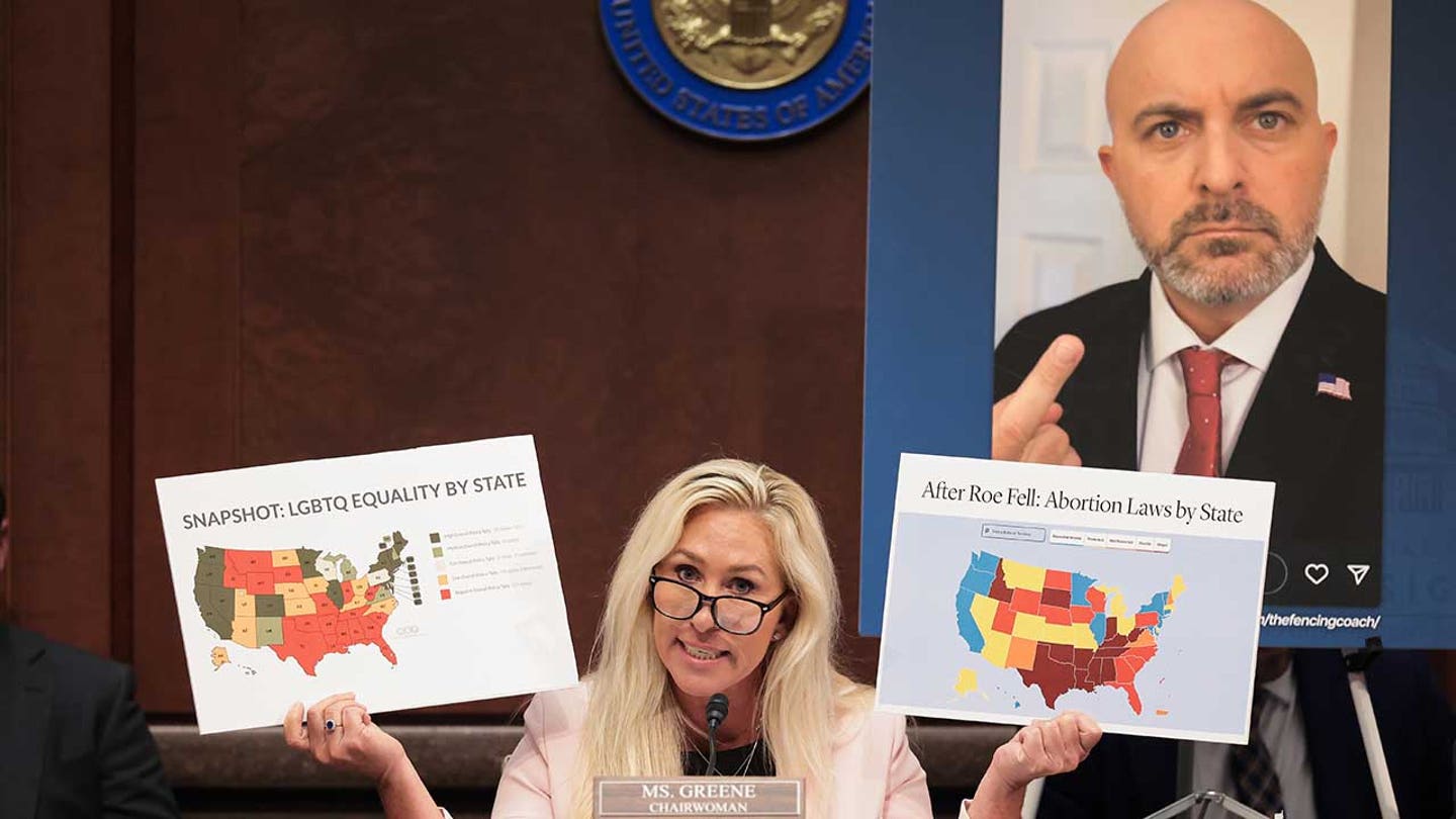 Rep. Marjorie Taylor Greene, R-Ga., holds up maps of the United States in front of a purported screenshot of Damien Lehfeldt’s Instagram during a House subcommittee hearing at the U.S. Capitol on May 7, 2025. (Kayla Bartkowski/Getty Images)