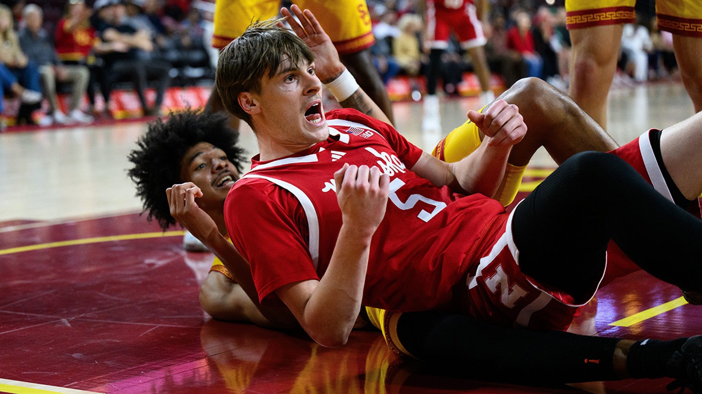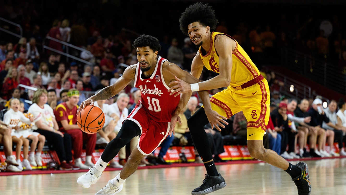 Nebraska forward Braden Frager (5) and Southern California forward Chad Baker-Mazara, left, react after hard contact during the first half of an NCAA college basketball game, Saturday, Feb. 28, 2026, in Los Angeles. (AP Photo/William Liang)