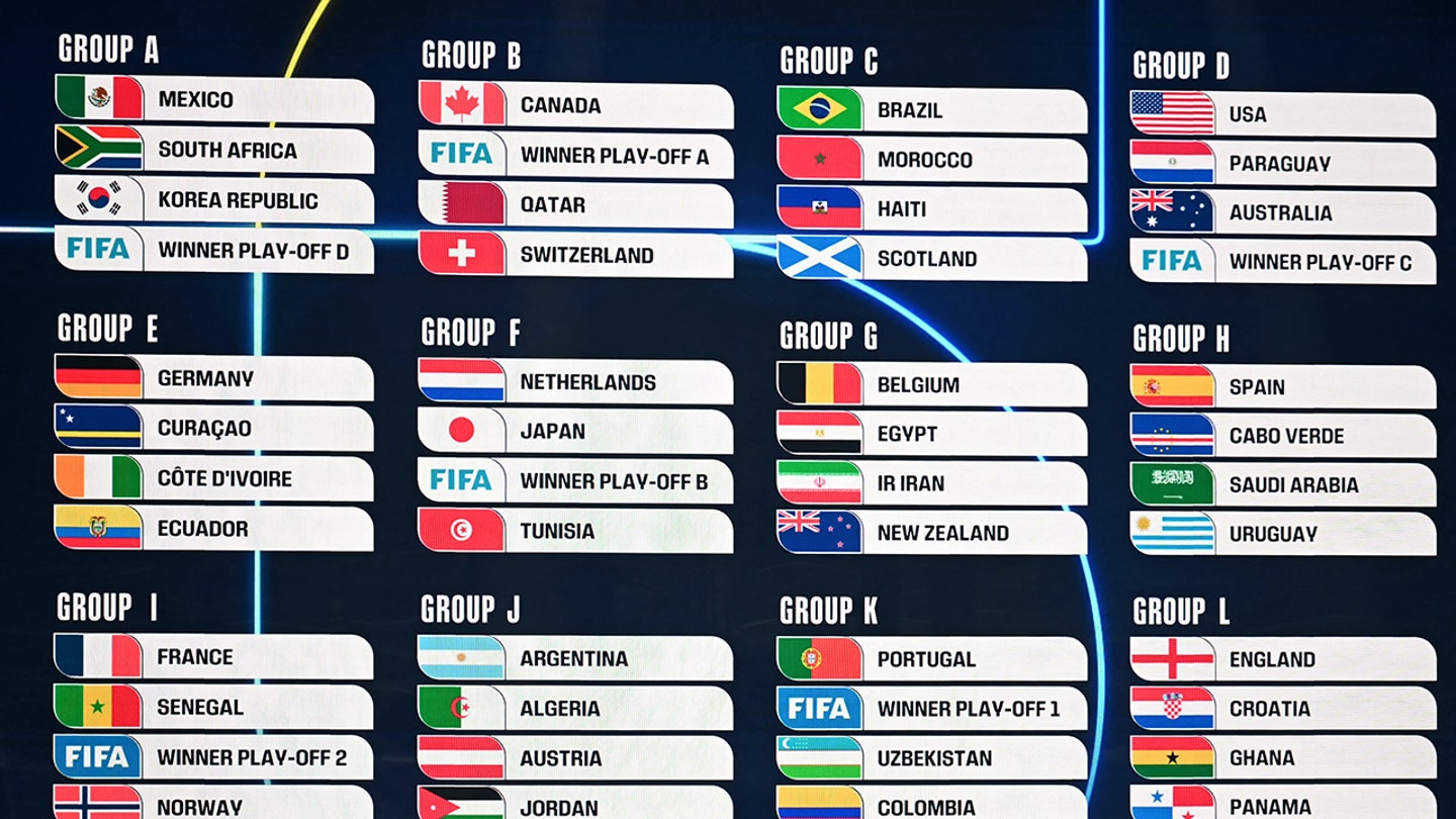 A photo shows groups A, B, C, D, E, F, G, H, I, J, K and L during the draw for the 2026 FIFA World Cup to be held in the United States, Canada and Mexico at the Kennedy Center in Washington, DC on December 5, 2025. (Jim Watson/AFP via Getty Images)