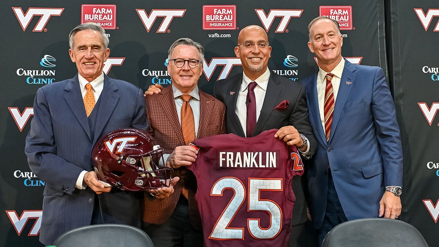 John Rocovich, Timothy Sands, James Franklin and Whit Babcock hold up a Virginia Tech jersey during a press conference naming Franklin as head coach at Cassell Coliseum in Blacksburg, Virginia on November 19, 2025. (Brian Bishop/Imagn Images)