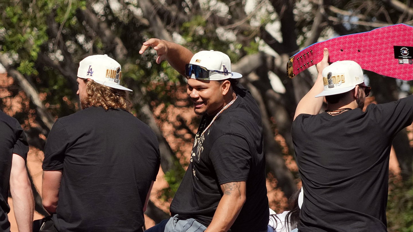 The launcher of the Dodgers Brusdar Graterol famous with teammates on the bus during the parade of the World Series 2024 championship near the Los Angeles City Hall. (Kirby Lee-Imagn images)