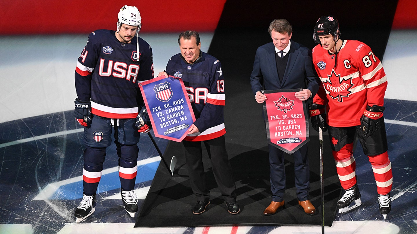 The USA Auston Matthews team attacker, on the left, and the former hockey player Mike Eruzione and the former hockey player Wayne Gretzky and the team Canada Sidney Crosby (87) during the 4 nations hockey championship match at TD Garden on February 20, 2025. (Images of Brian Fluhaty / Imagn)