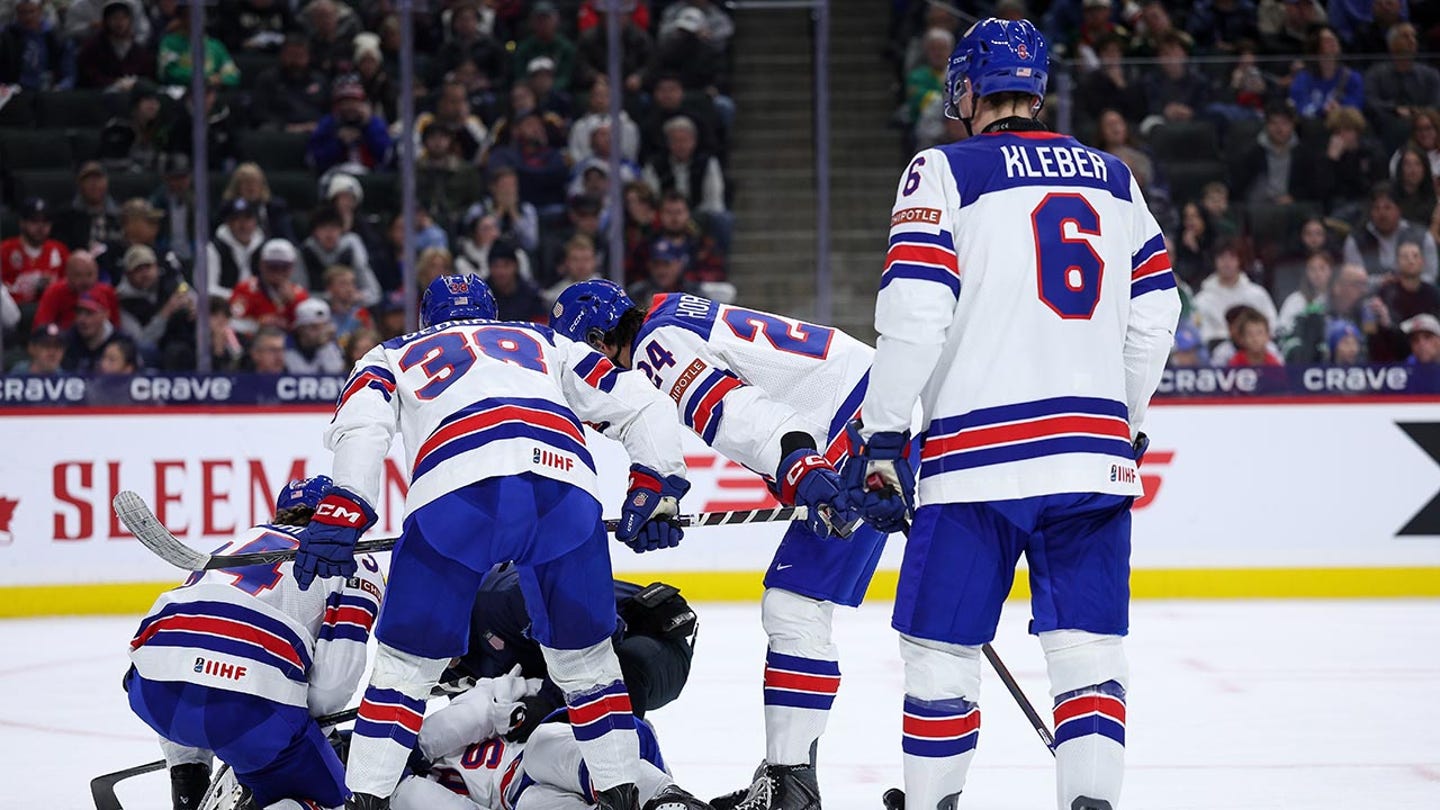 World Juniors: Cole Hutson of the American team leaves the match on a stretcher