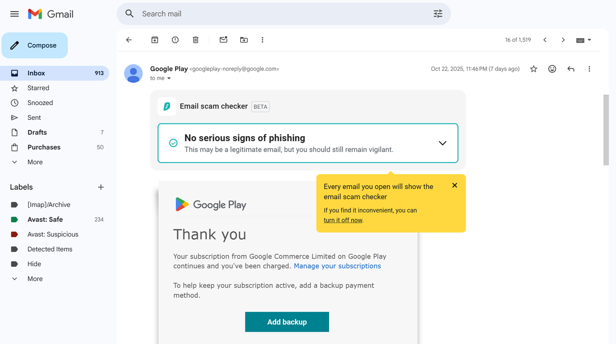 Considering the tool is still in beta, this is a pretty solid result! And we were at least warned that “you need to stay vigilant” for the three emails he didn’t actually catch.