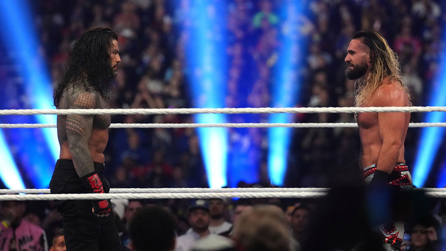 February 1, 2025; Indianapolis, in: Roman Reigns and Seth Rollins during the Royal Rumble’s Royal match during the Royal Rumble WWE at Lucas Oil Stadium. (Joe Camporeale-Imagn images)
