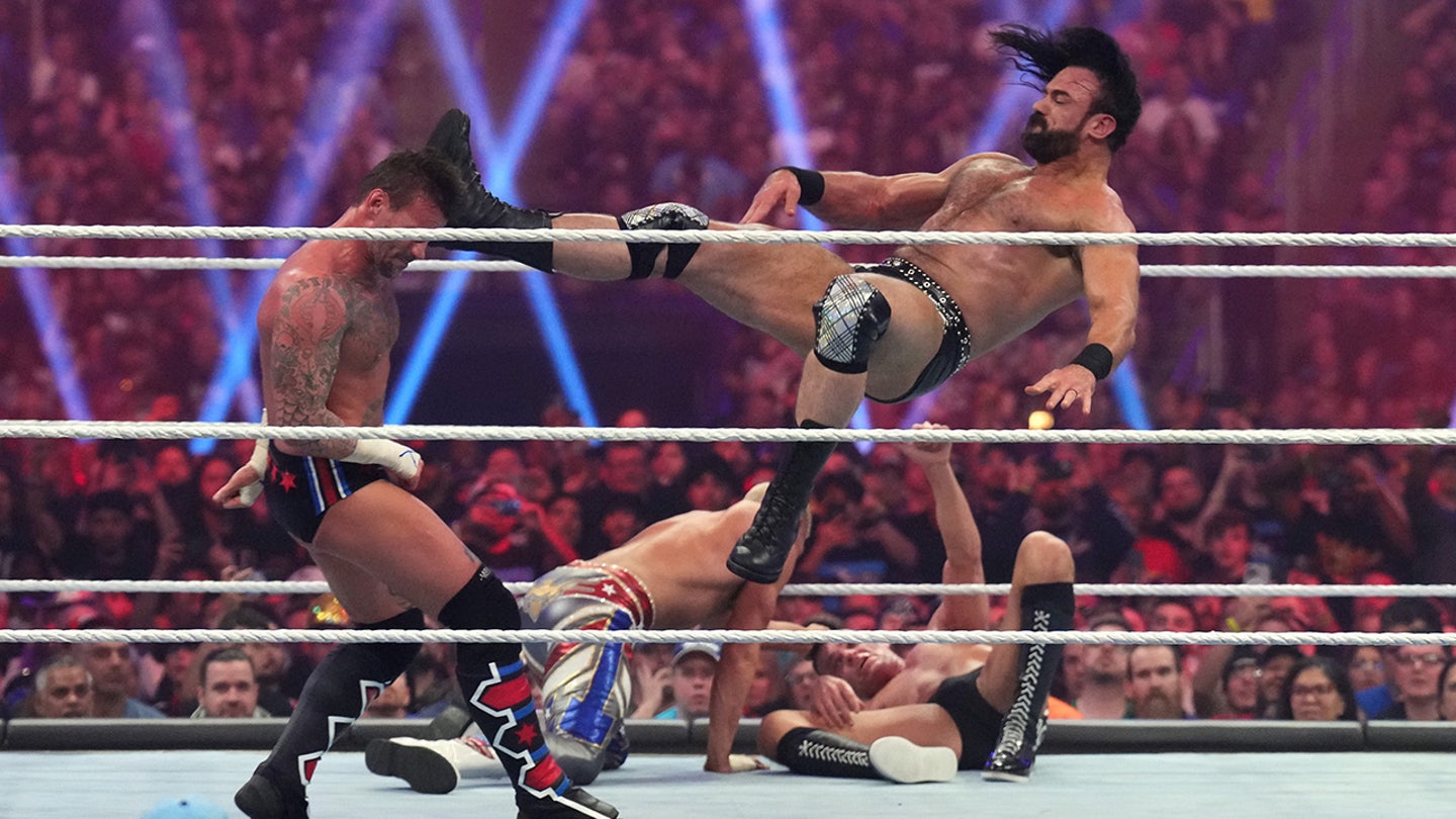 Drew McIntyre, on the right, kicked CM Punk during the Royal Rumble Male match in Tropicana Field in Saint Petersberg, Florida, January 27, 2024. (Joe Camporeale-USA TODAY SPORTS)