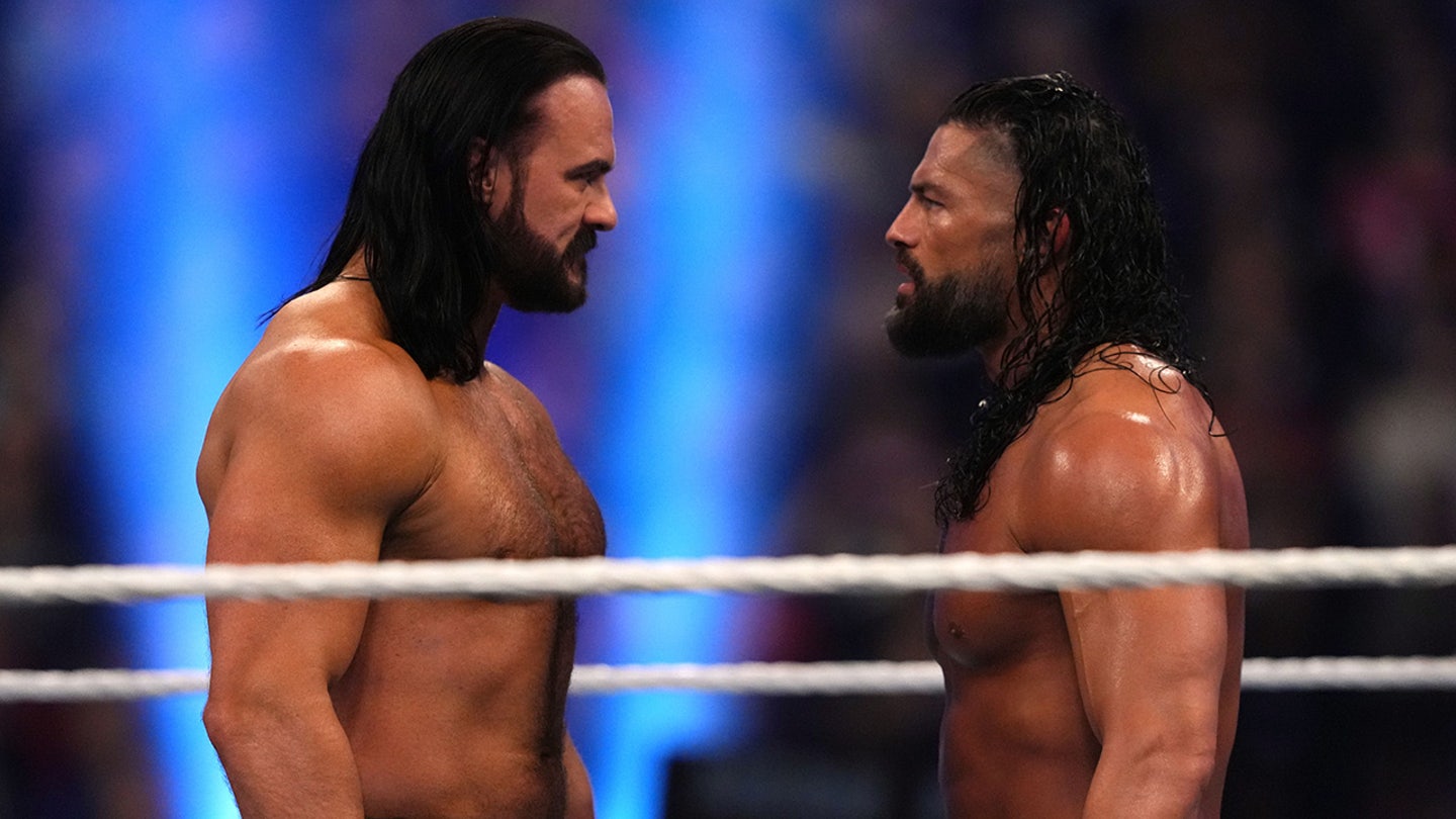 Drew McIntyre and Roman Reigns, on the right, during the Royal Rumble’s Royal match during the Royal Rumble of Lucas Oil Stadium in Indianapolis on February 1, 2025. (Joe Camporeale-Imagn images)